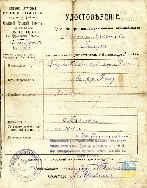 Harkivas latviešu bēgļu komitejas izdota apliecība Robertam Pilupam par to, ka viņš ir bēglis no Latvijas.1919. gada 12. novembris