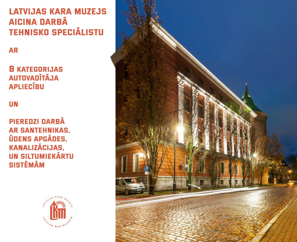 Pieteikumu, kurš satur motivācijas vēstuli un dzīves un darba gaitu aprakstu (CV) ar norādi “Tehniskais speciālists” iesniegt elektroniski, iesūtot dokumentus elektroniskā pasta adresē: personals@karamuzejs.lv, personīgi (Smilšu ielā 20, Rīgā, LV-1050, 24. kabinets) vai sūtot pa pastu (Kara Muzejam, Smilšu ielā 20, Rīgā, LV-1050) līdz 2023. gada 14. janvārim. Papildus informācija Jānis (67213219), Iveta (25640662)