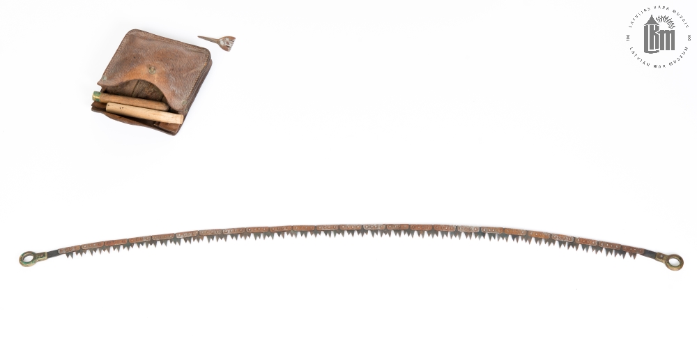 Priekšmeta muzejisko vērtību ne vienmēr nosaka izplatība, cena un datējums. Citreiz to nosaka tā atbilstība oriģinālai komplektācijai un visu komplektējošo elementu klātbūtne. Kā redzams attēlā, saliekamais zāģis sastāv no četriem elementiem: zāģa, rokturiem, apkopes instrumenta un ādas futlāra ar nodalījumiem. Tieši ādas futlāris, kā miera laikiem visērtāk pielāgojamais elements, visbiežāk tika izņemts no oriģinālā komplekta un nozaudēts. Tomēr šajā gadījumā Latvijas Kara muzeja krājumu ir papildinājis pilns saliekamā zāģa komplekts ar saglabājušos ādas futlāri un apkopes instrumentu.
