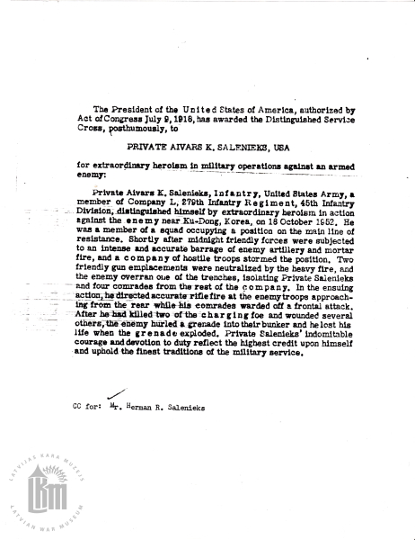 ASV armijas 45. kājnieku divīzijas 279. kājnieku pulka L rotas karavīra Čārlza Klenklina paziņojums sakarā ar Aivara Kārļa Salenieka apbalvošanu. 1988. gada 4. janvāris