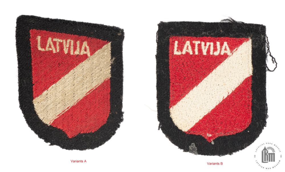 Uzšuves "vairodziņš" agrīnie varianti bez uzraksta Latvija: A) Izšūts paveids 1942. g. paraugs; B) Sietspiedes drukāts paveids (dažkārt tiek uzskatīts par vairodziņa sagatavi), 1942 - 1943.g. paraugs, neguva popularitāti vienībās