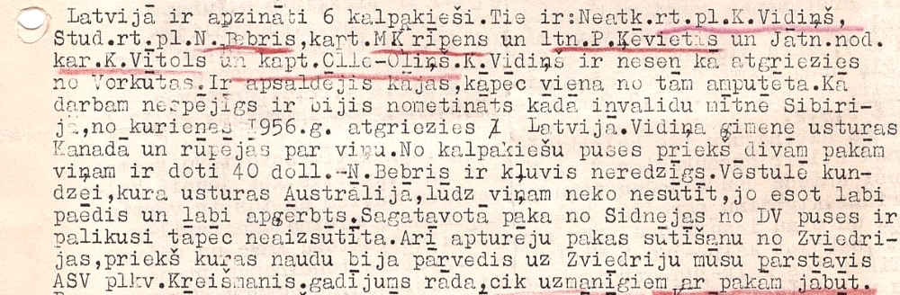 Savienības “Pulkveža Kalpaka bataljons” ziņojuma fragments, 1957. gada 6. janvāris. Ziņojuma autors- pulkvedis, savienības priekšsēdētājs Arvīds Krīpens